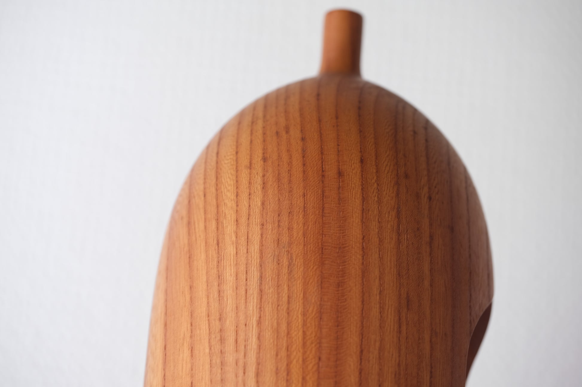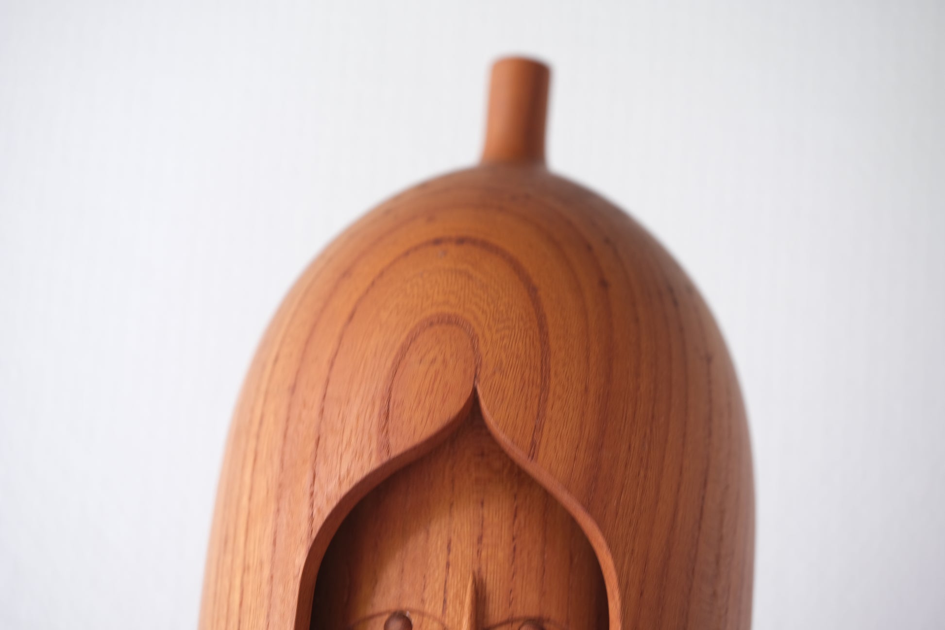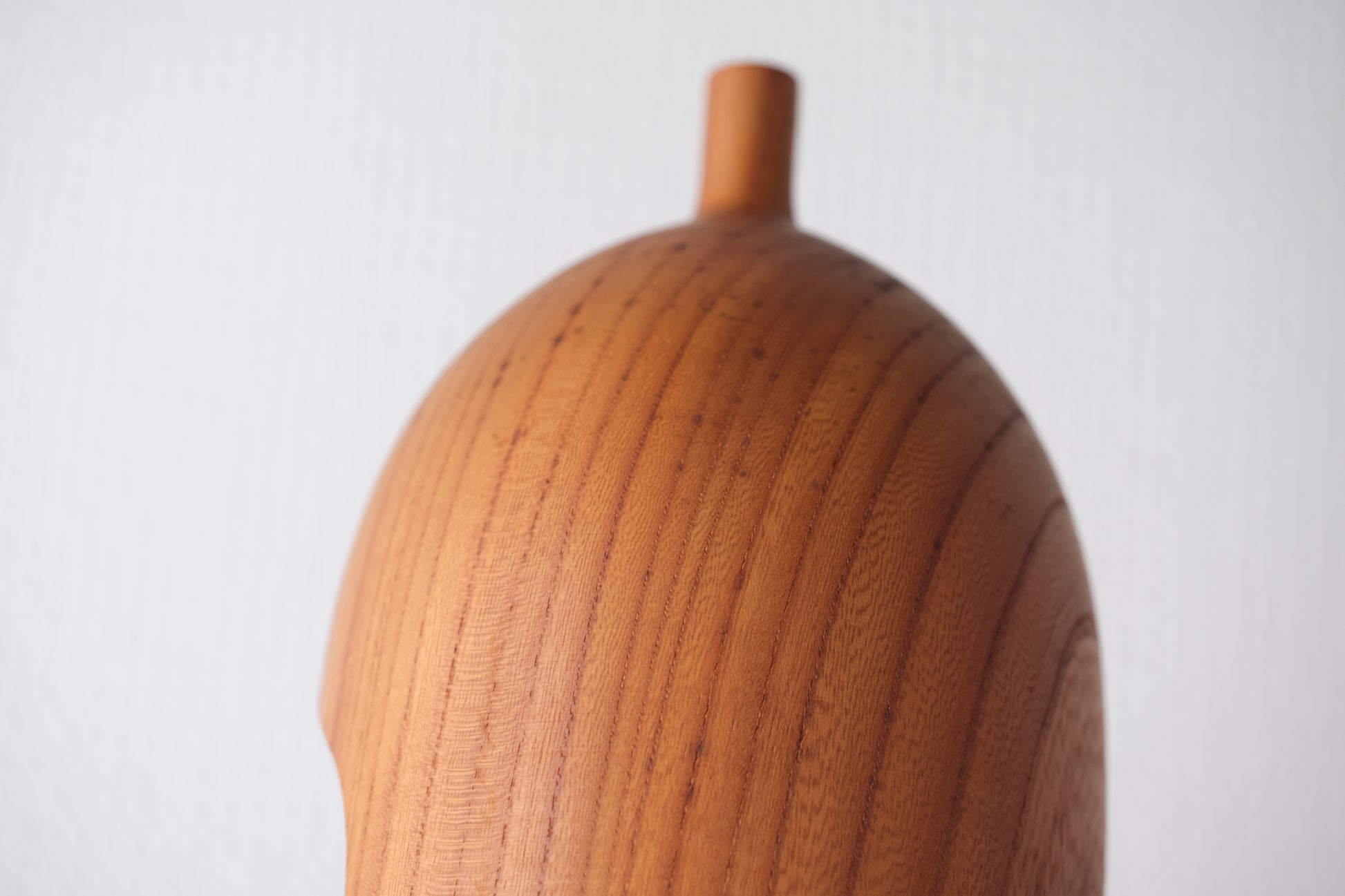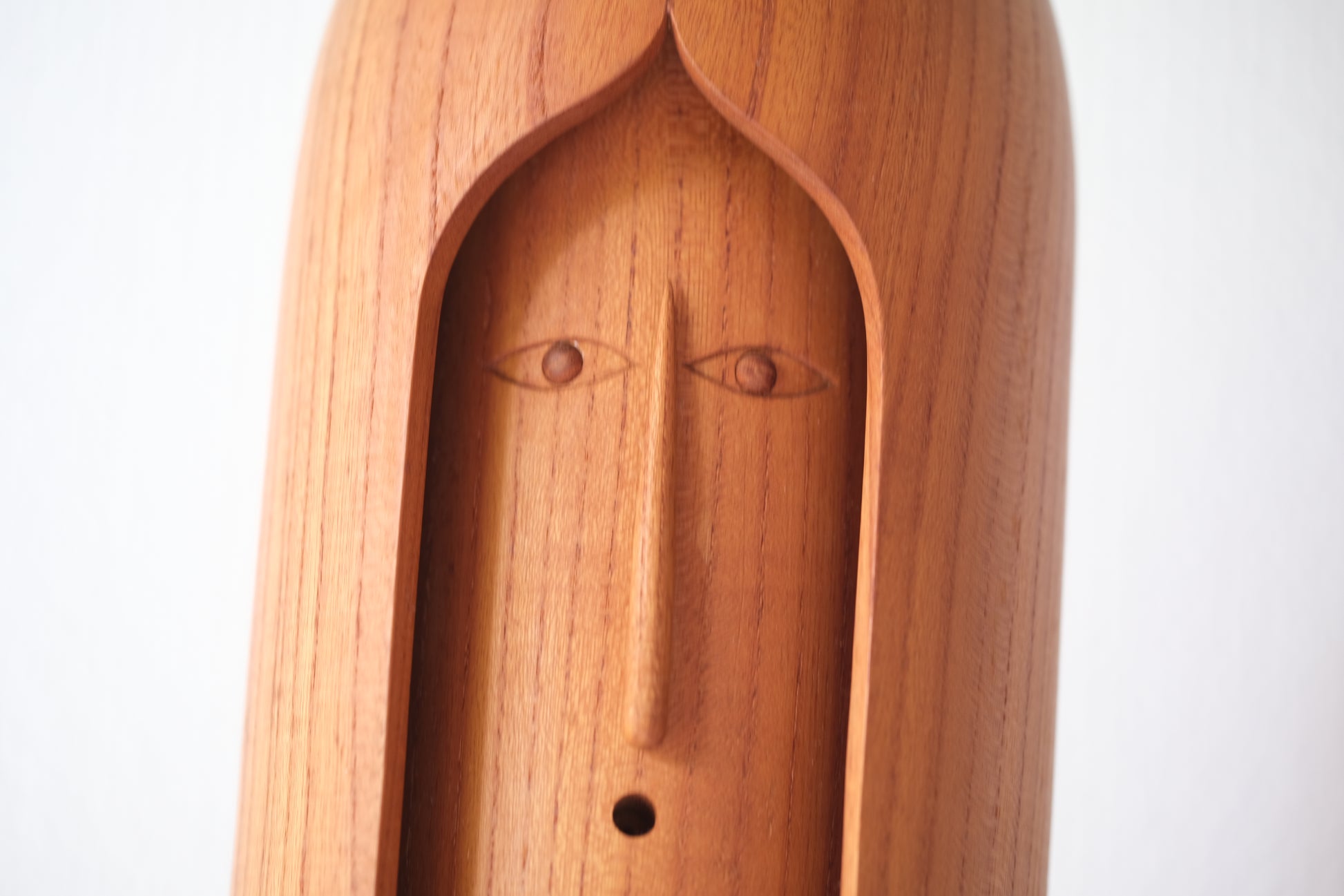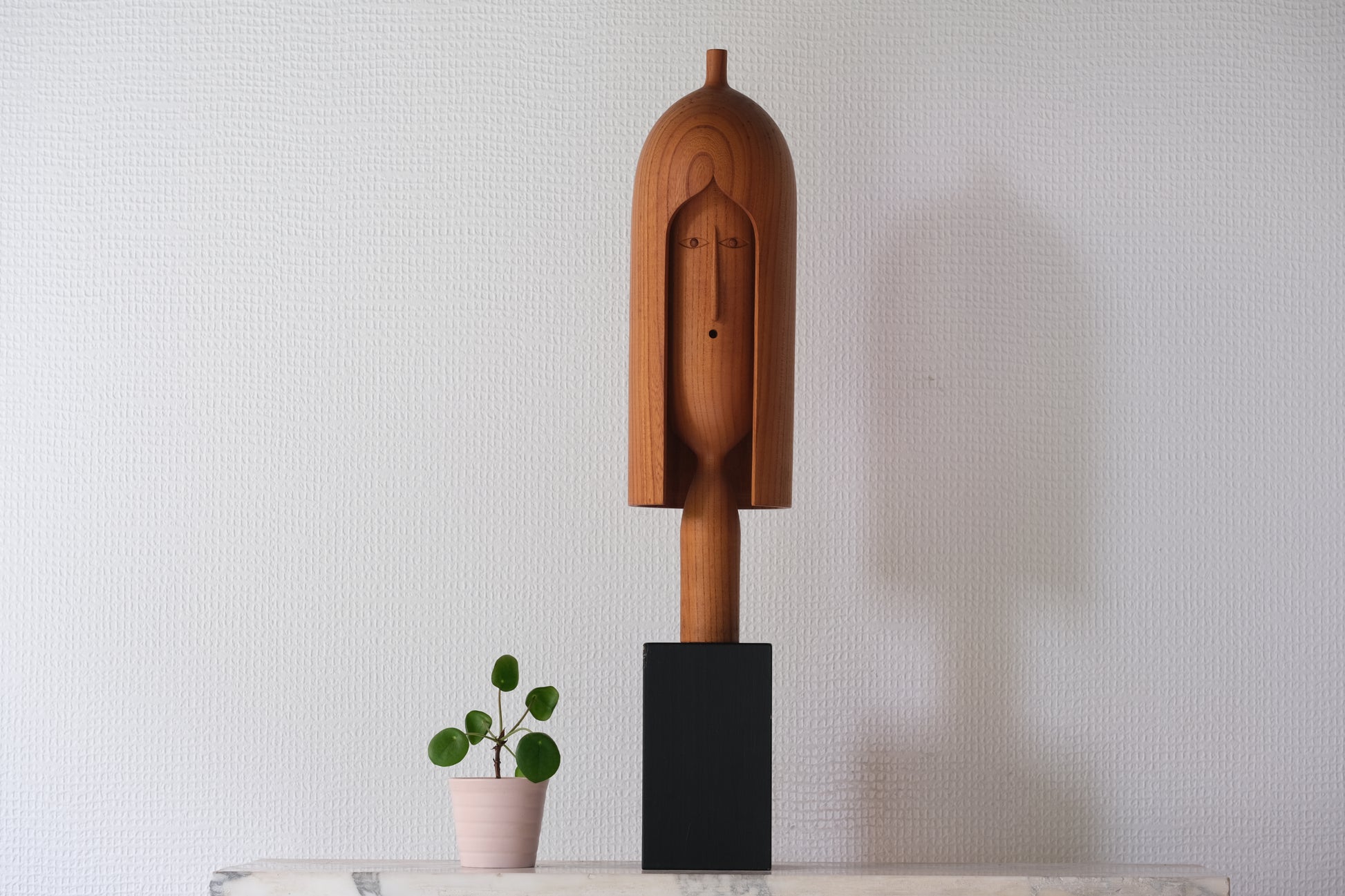 This kokeshi is a very rare piece by Shozan Shido. She is for sure different from his other designs as it is mainly a representation of a face instead of a 'whole' kokeshi. She is made from beautiful wood. Features that resemble his other work are the hairstyle and the mouth (a small hole). This kokeshi is a once in a lifetime opportunity.