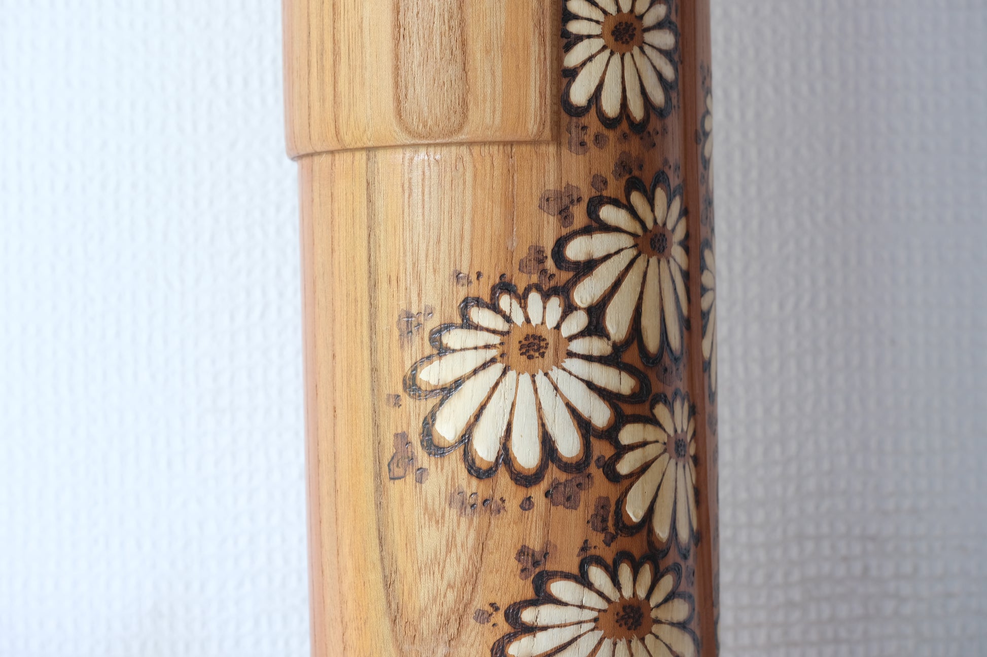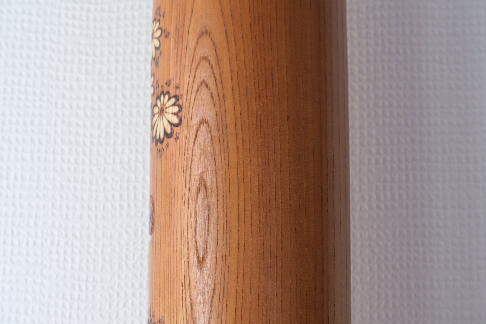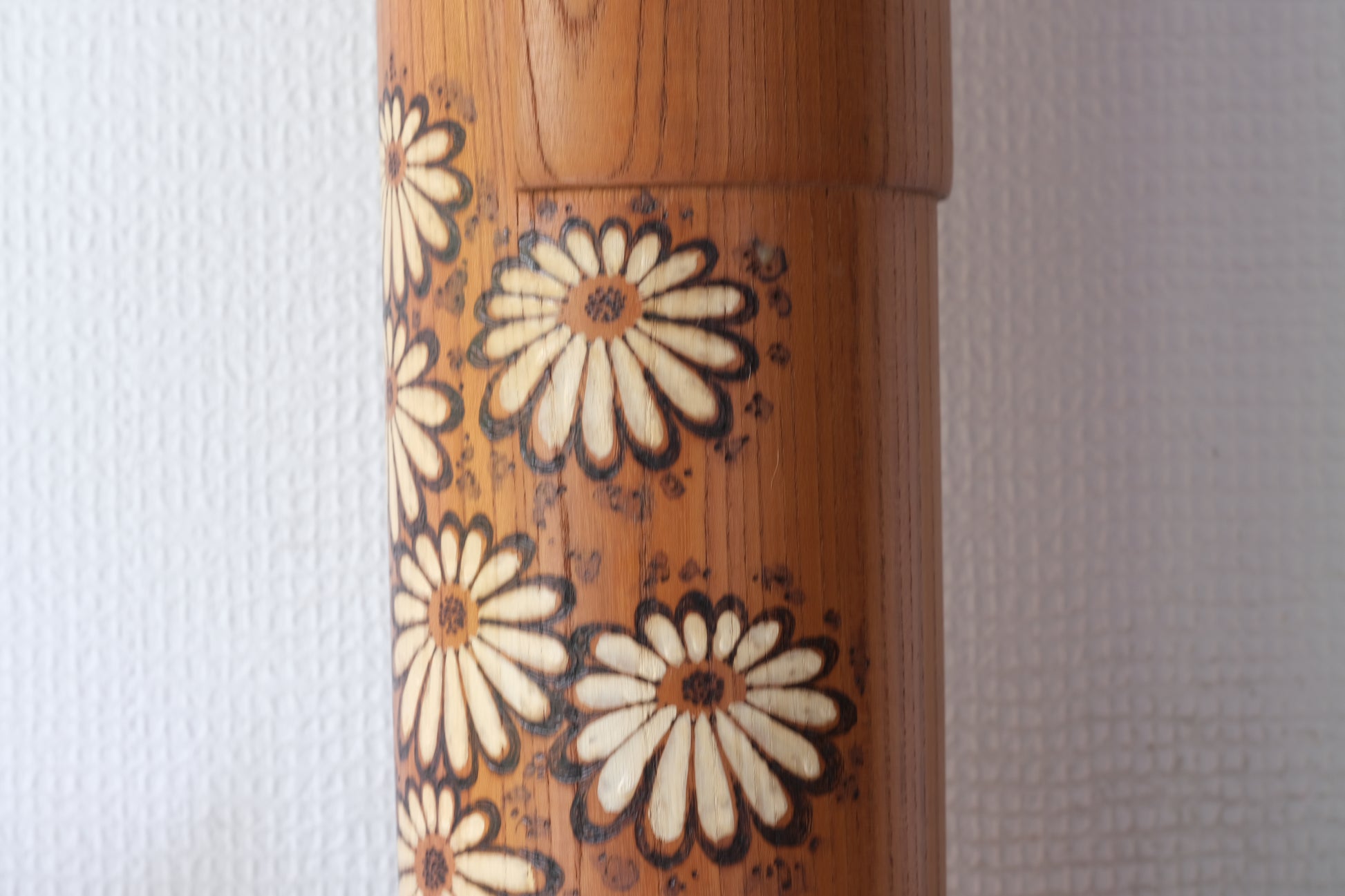 This kokeshi wears a kimono with a white flowers and a beautiful ribbon.