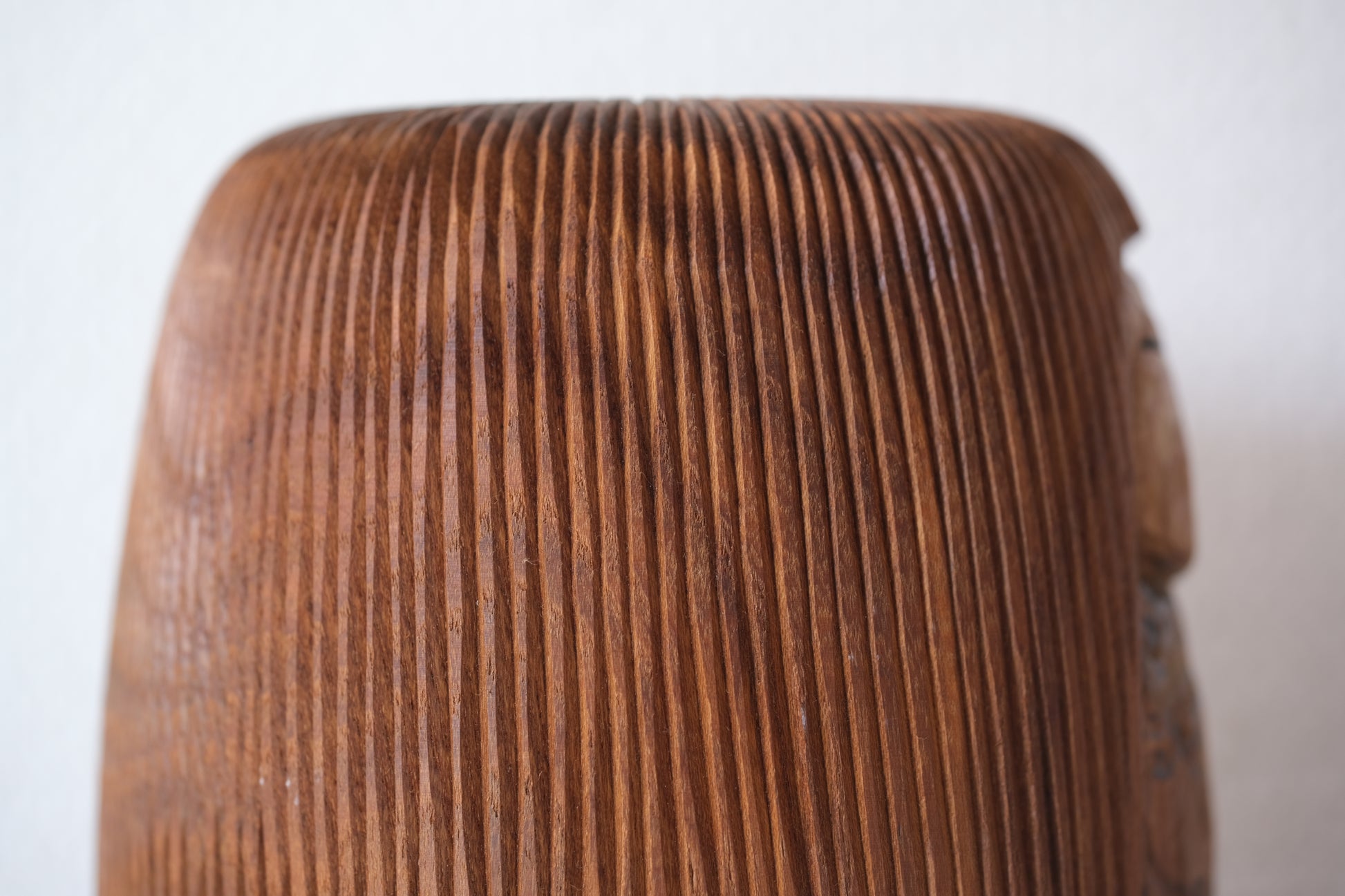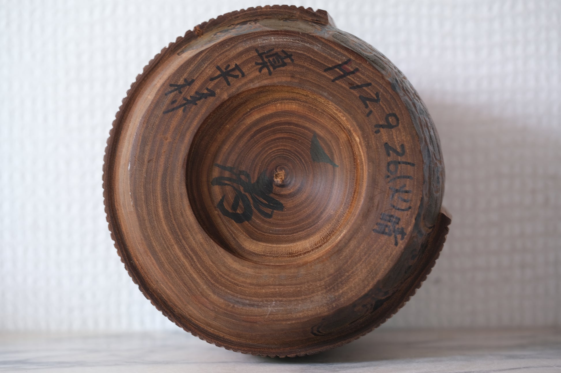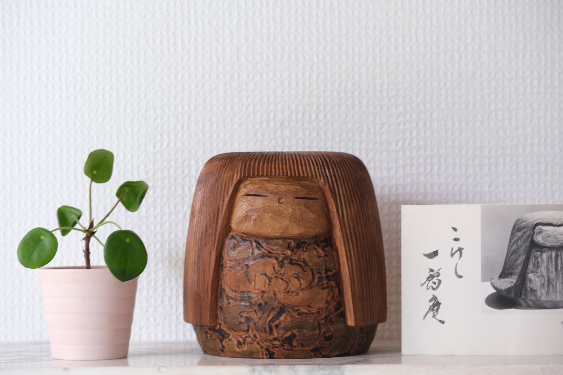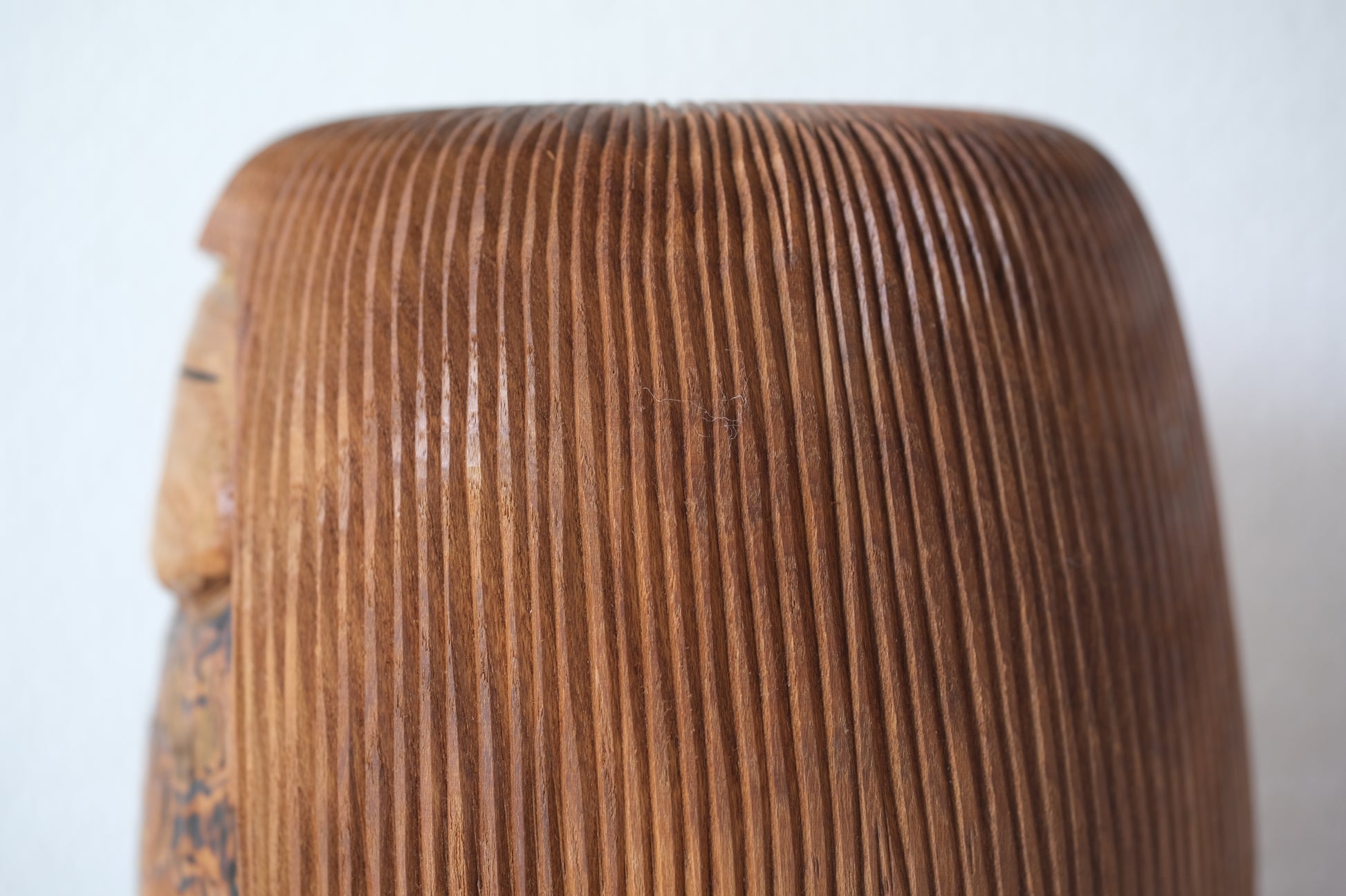 This kokeshi by Issetsu Kuribayashi has a beautiful yet strong appearance. As in most of Kuribayashi's dolls the natural wood has a predominant role. The deep carved lines on her body form a flowers and is very passionately executed. The wood used for this kokeshi is most likely Enju (Japanese pagoda tree). This kokeshi is dated Heisei 12 which corresponds to 2000.