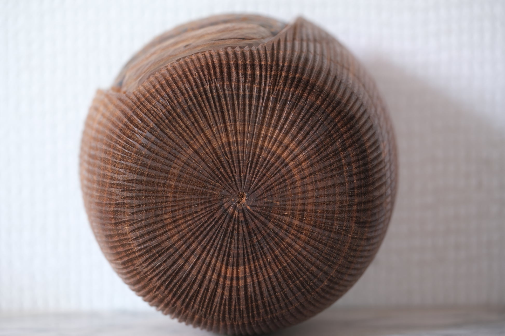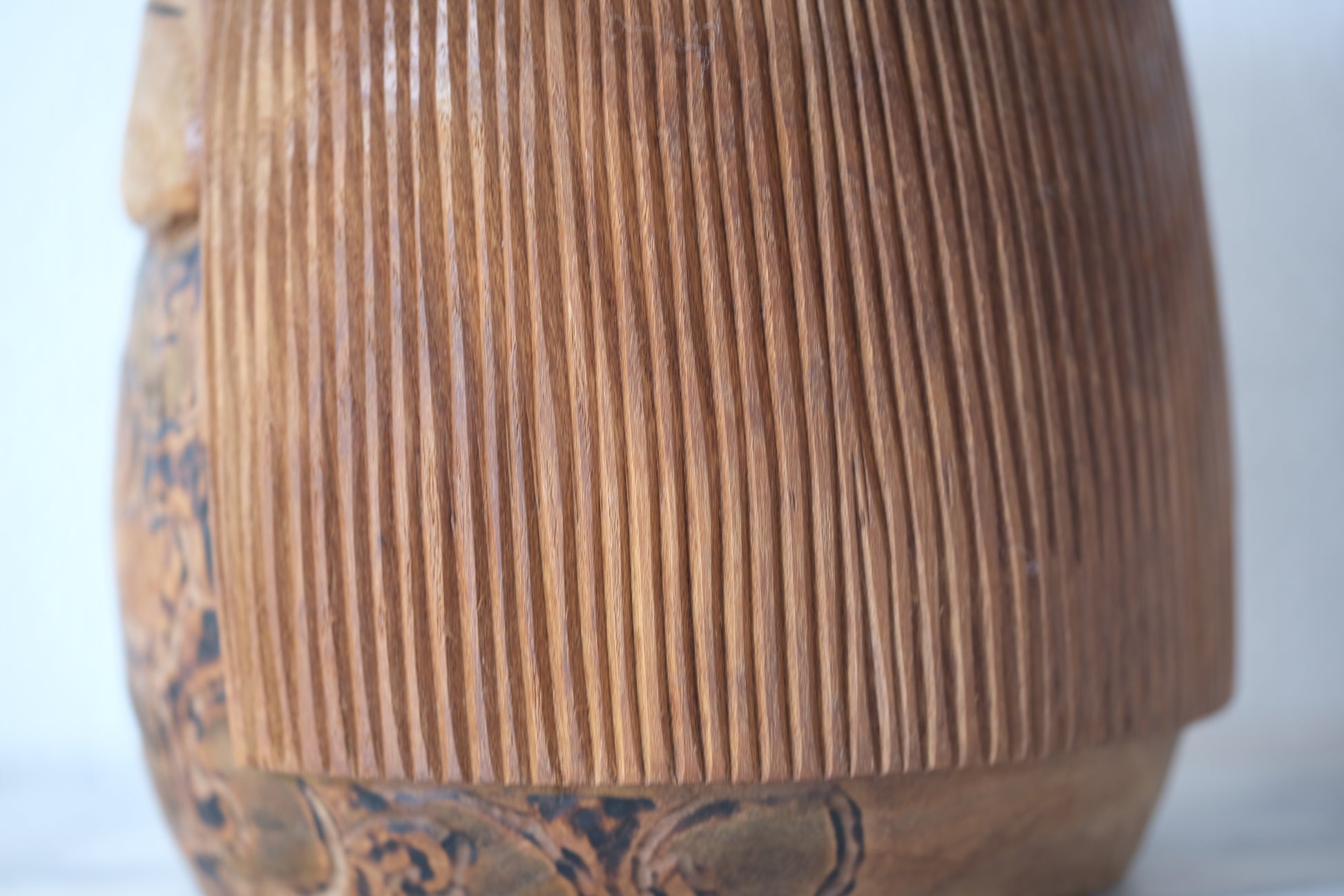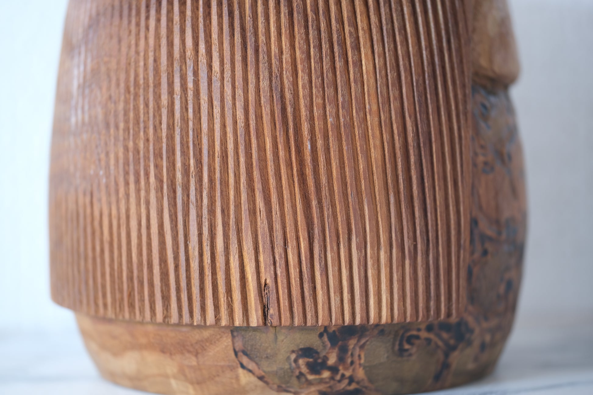 This kokeshi by Issetsu Kuribayashi has a beautiful yet strong appearance. As in most of Kuribayashi's dolls the natural wood has a predominant role. The deep carved lines on her body form a flowers and is very passionately executed. The wood used for this kokeshi is most likely Enju (Japanese pagoda tree). This kokeshi is dated Heisei 12 which corresponds to 2000.