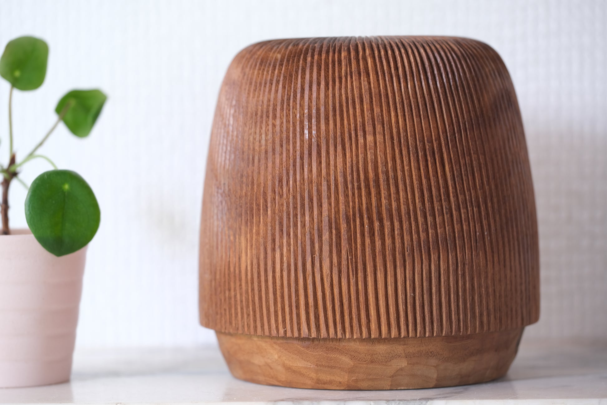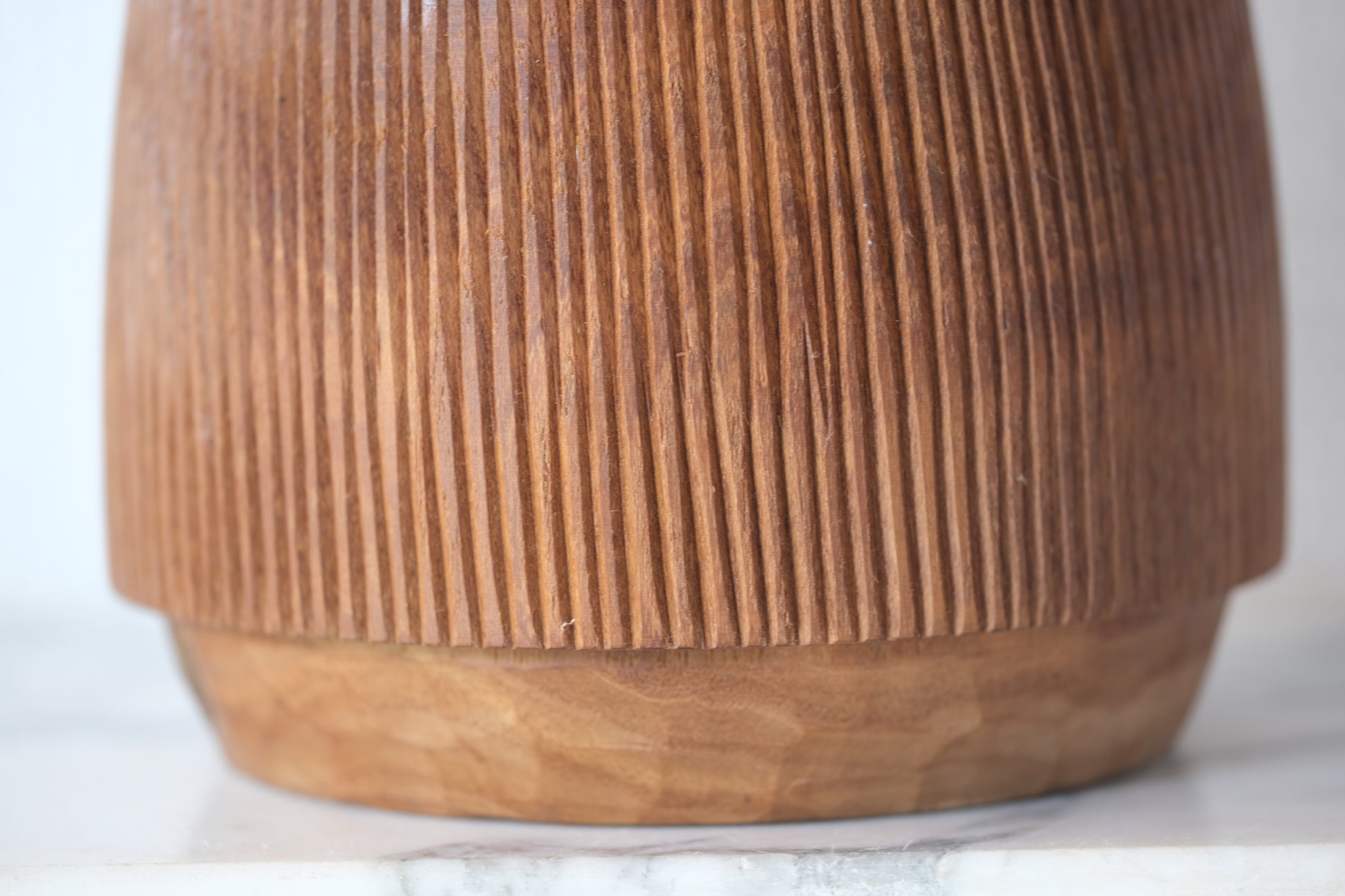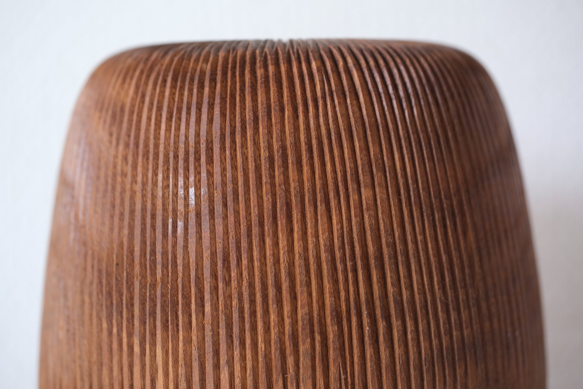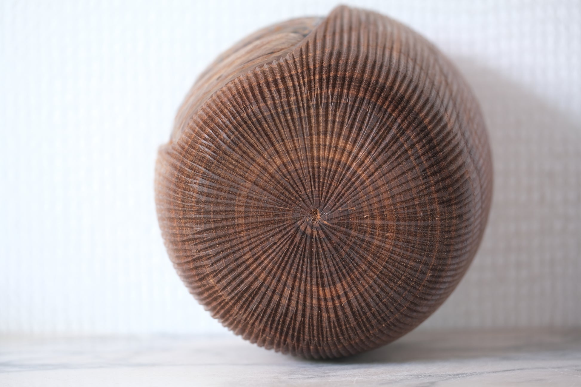 This kokeshi by Issetsu Kuribayashi has a beautiful yet strong appearance. As in most of Kuribayashi's dolls the natural wood has a predominant role. The deep carved lines on her body form a flowers and is very passionately executed. The wood used for this kokeshi is most likely Enju (Japanese pagoda tree). This kokeshi is dated Heisei 12 which corresponds to 2000.