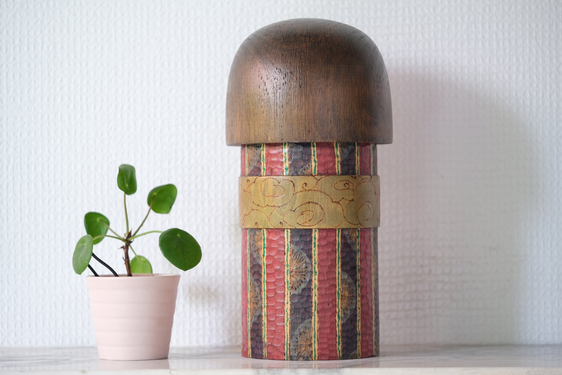 This kokeshi is a very lovely gumma design. Her kimono is so sophisticated with her elevated band and striped design with subtle flowers. What a perfect kokeshi and exclusive kokehsi by Sadao Kishi are hard to find.