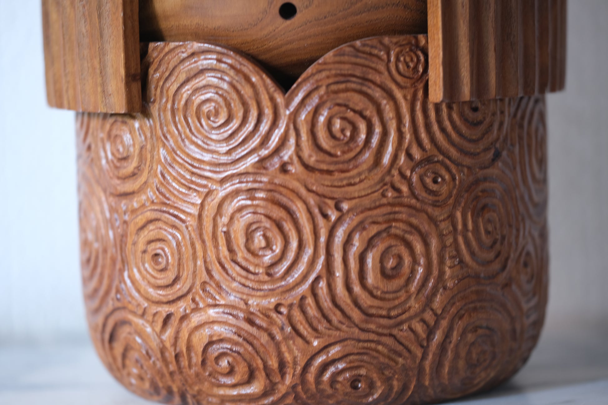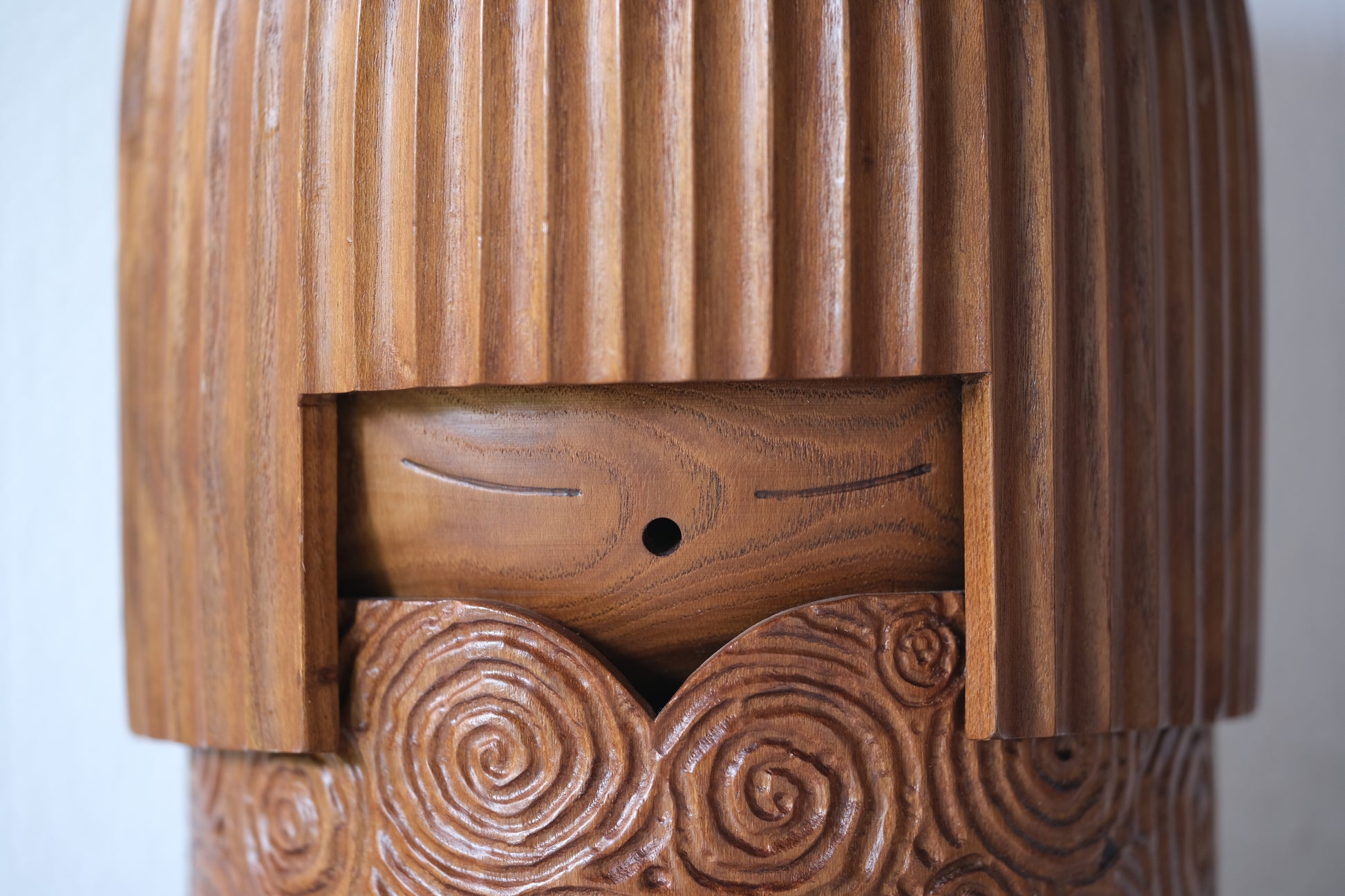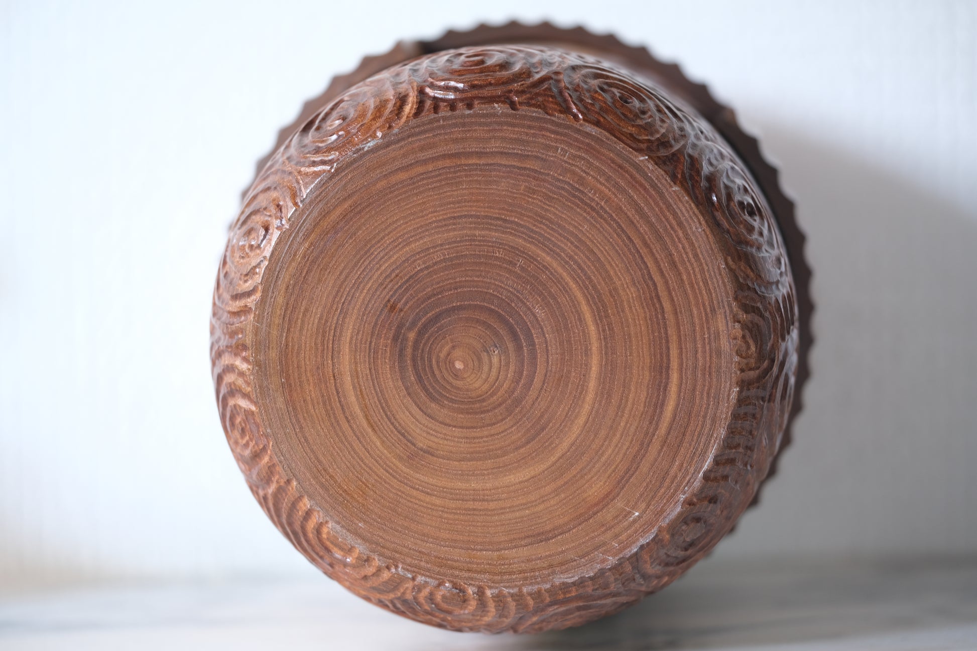 This vintage Kokeshi is rare version of a classic design by Shozan Shido. The round decorations are deeply carved and make the doll look more powerful. What is superb kokeshi. She is made in Showa 59 which corresponds to 1984.
