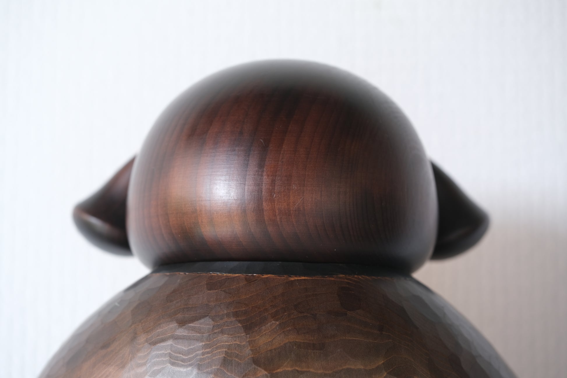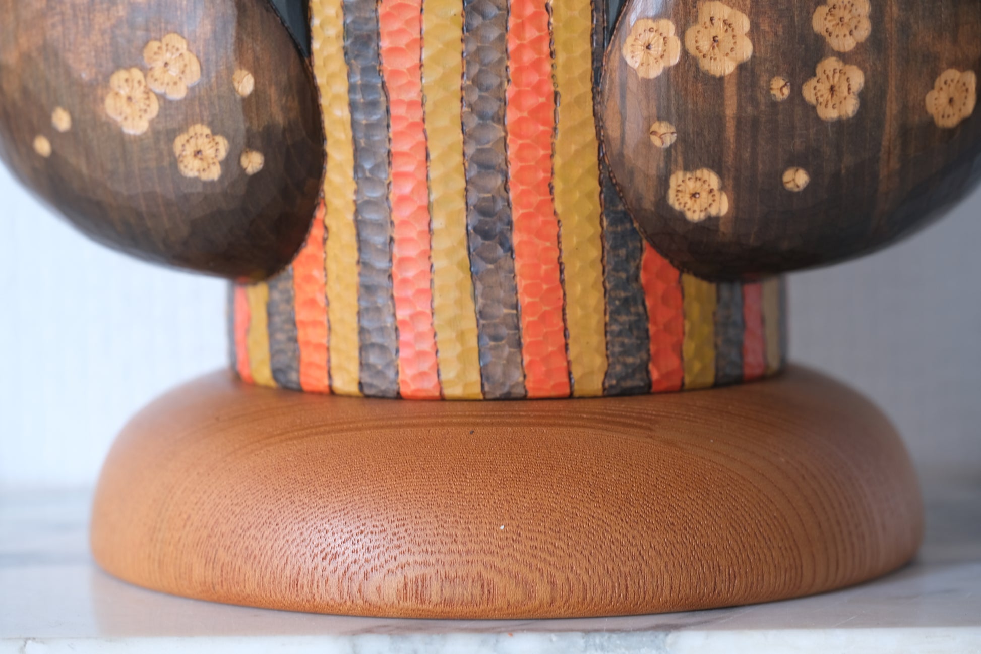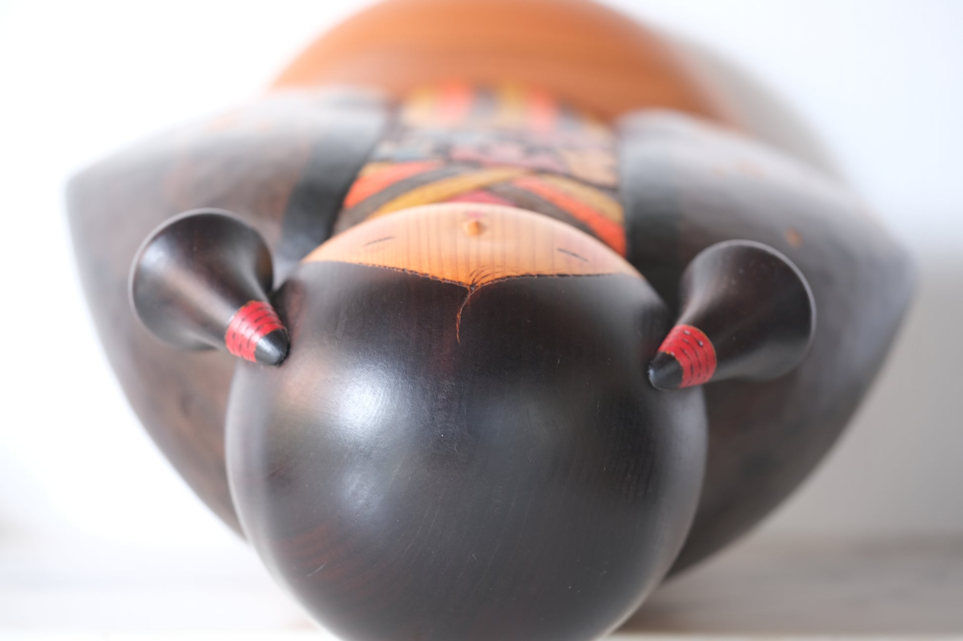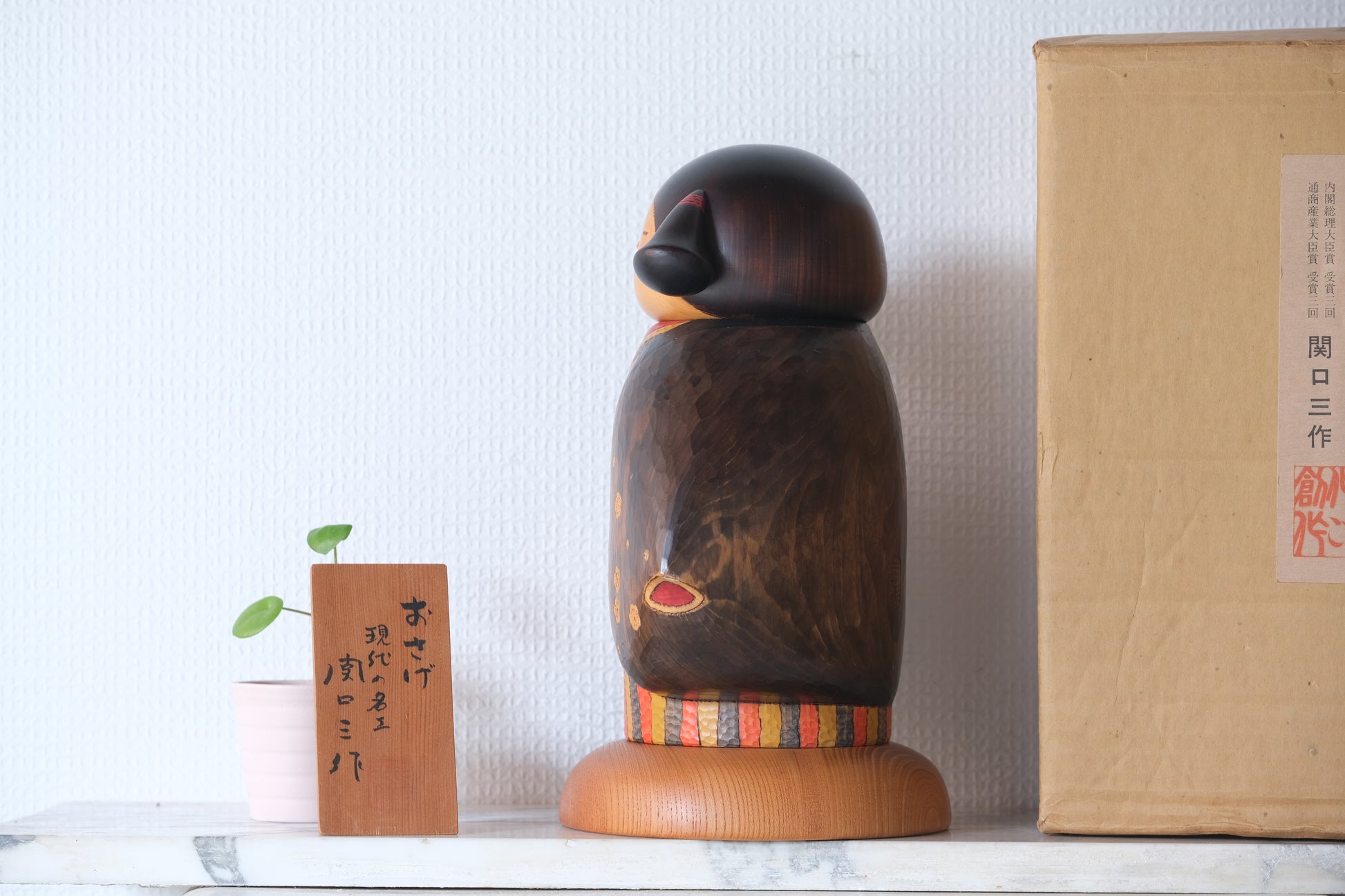 This kokeshi has the cutest pigtails and is made by Master Sansaku Sekiguchi. Needless to say that this work is high quality. The kimono and obi are very detailed and she really draws your attention.
