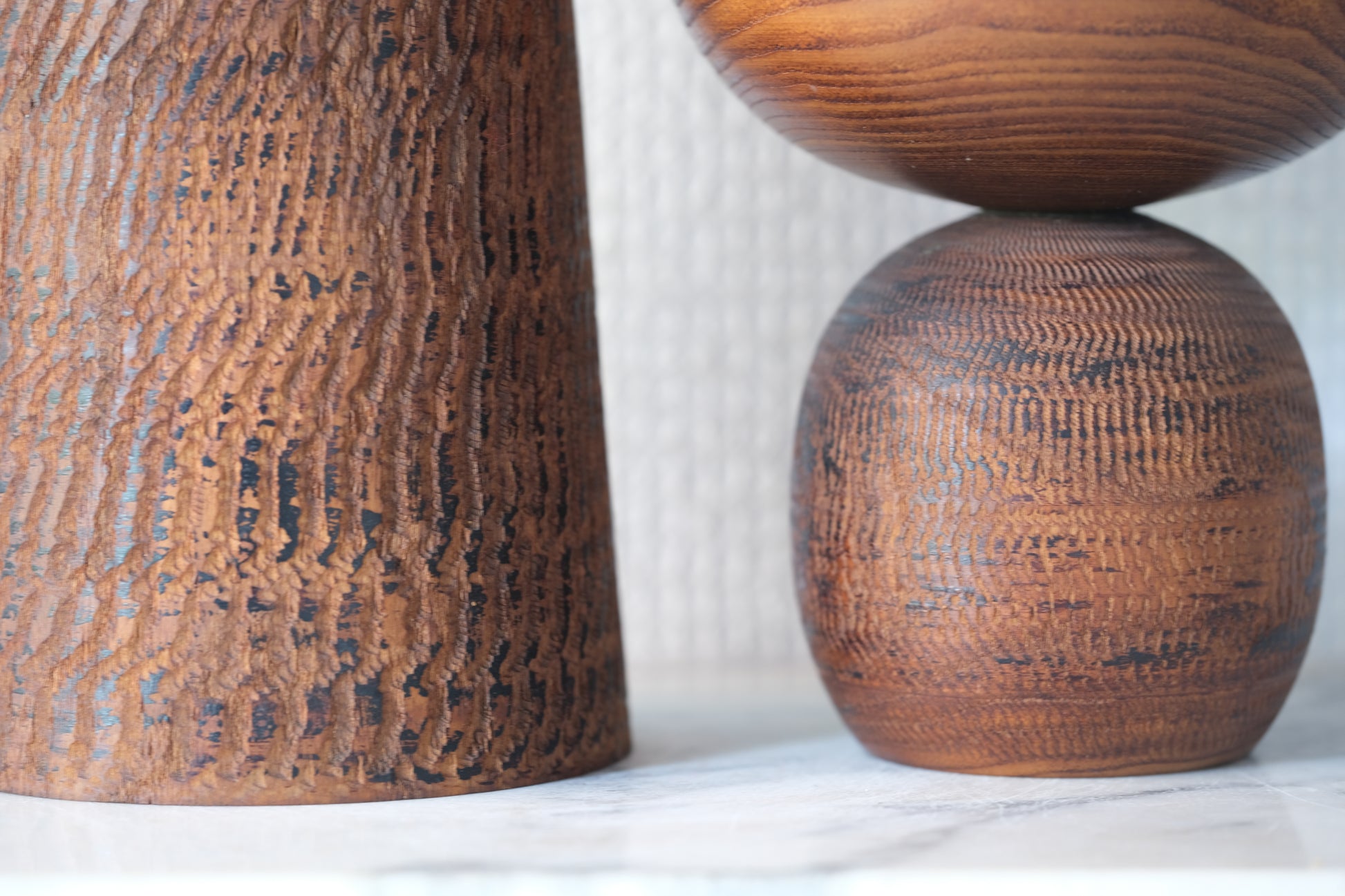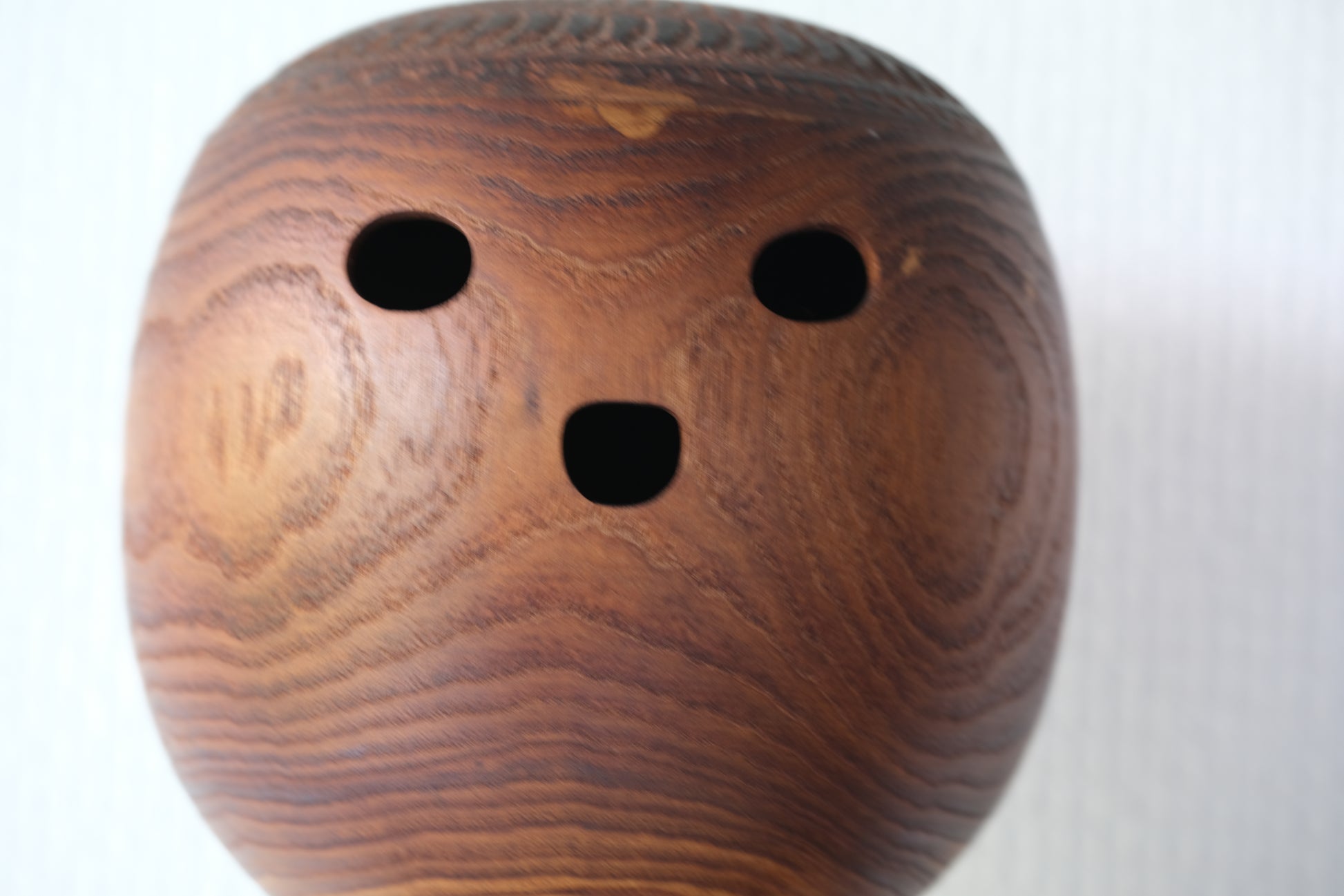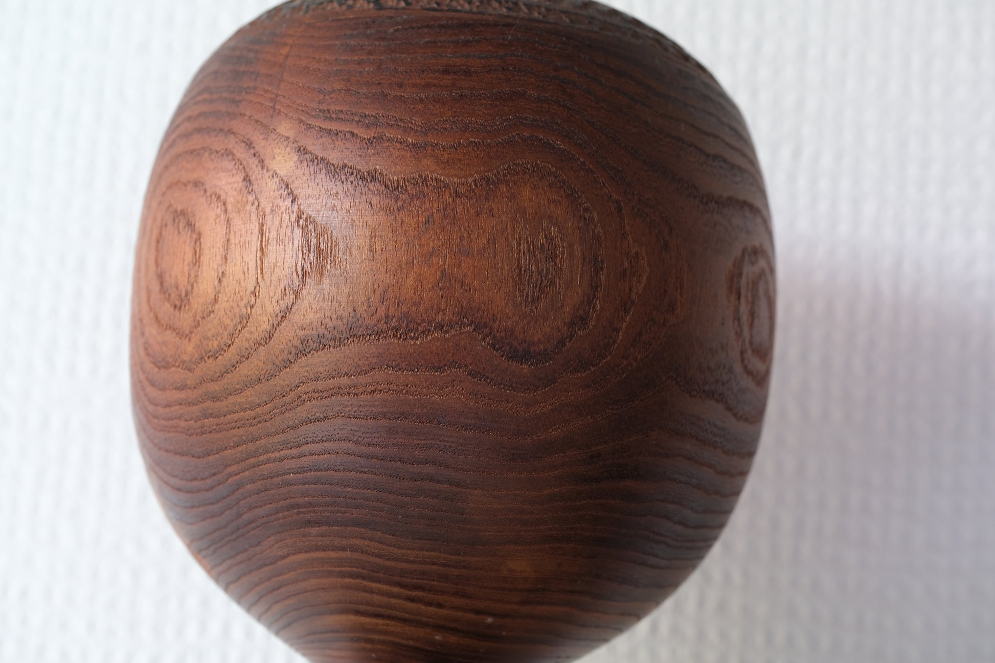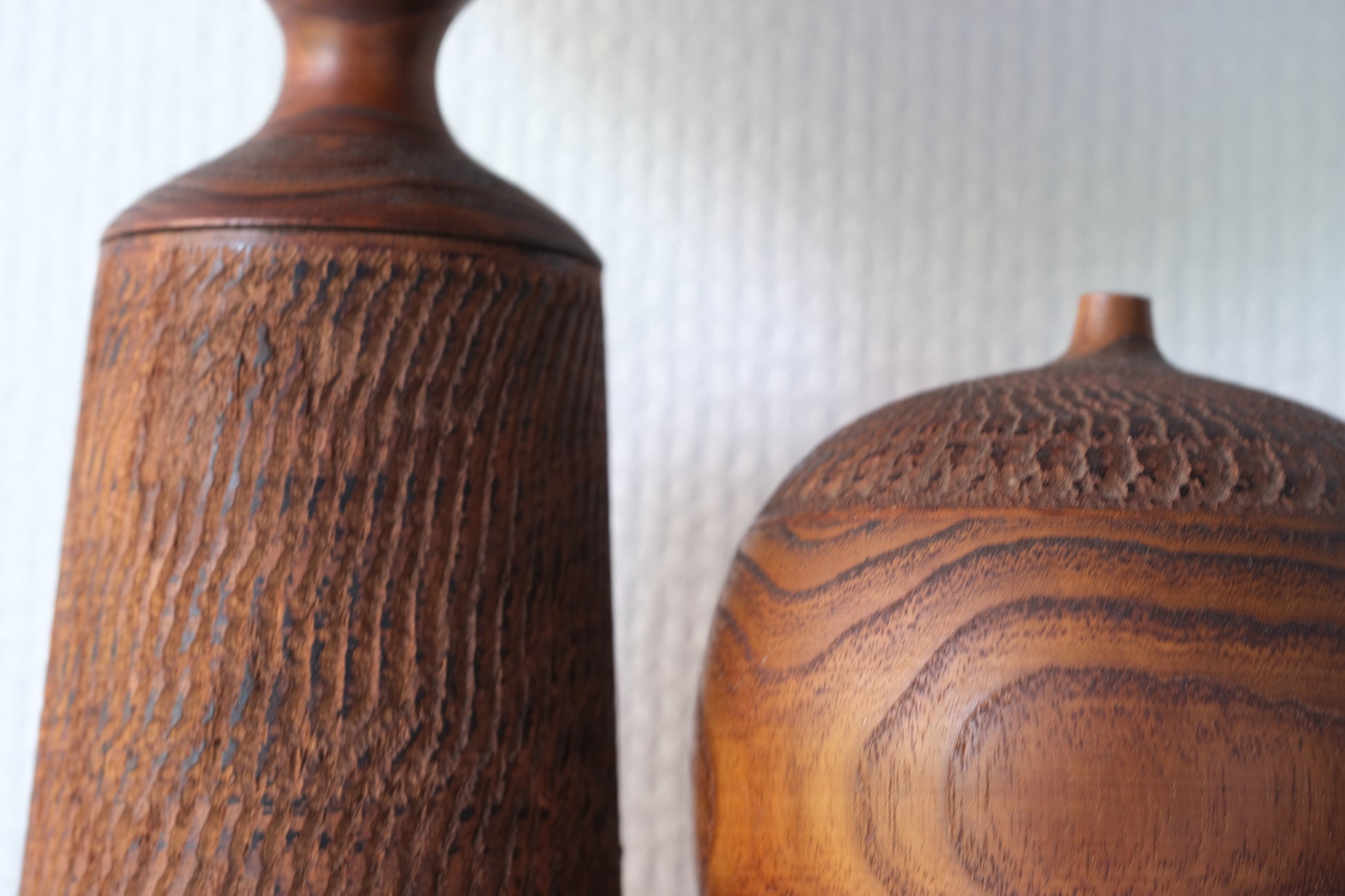 These kokeshi have very, almost Tribal forms. The engravings add to the drama of these kokeshi and the hollow eyes and mouth are maybe the main feature shaping the general feel of these kokeshi. These forms are highly unusual for kokeshi highlighting the creative and prominent role Hideo has as an innovator in the 60s. These kokeshi could be seen as a mother and her child.