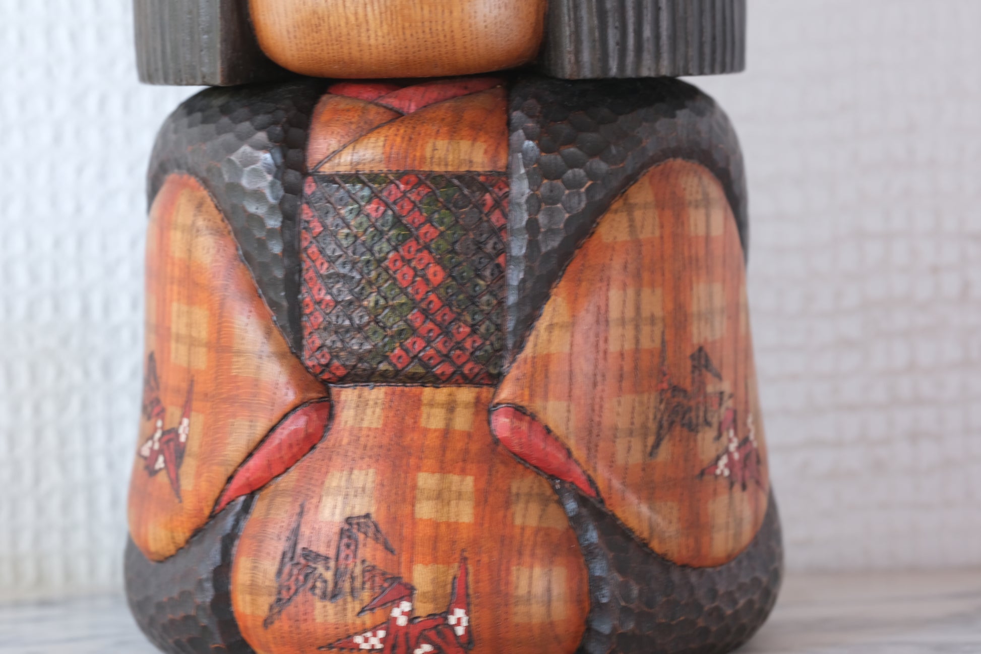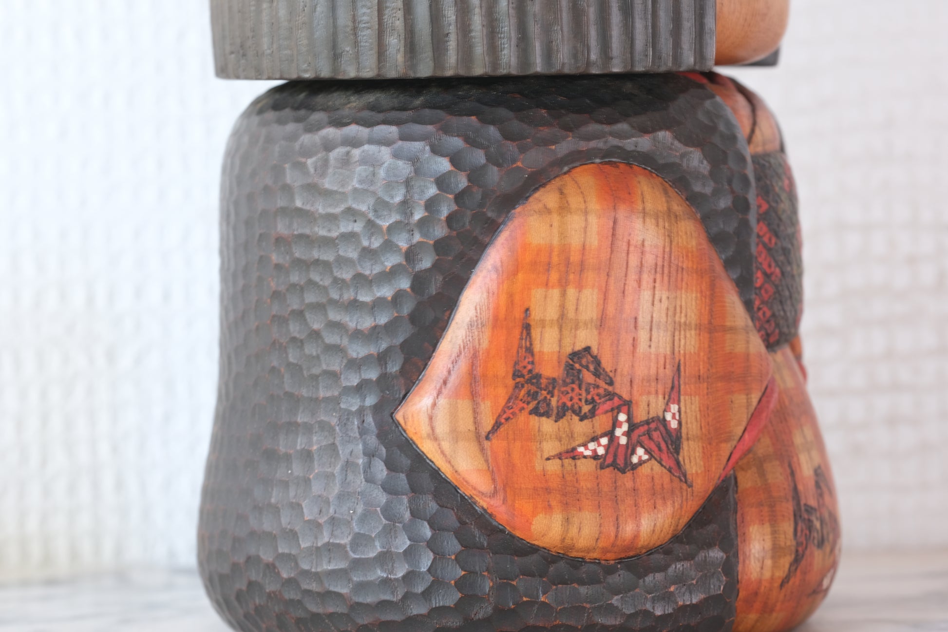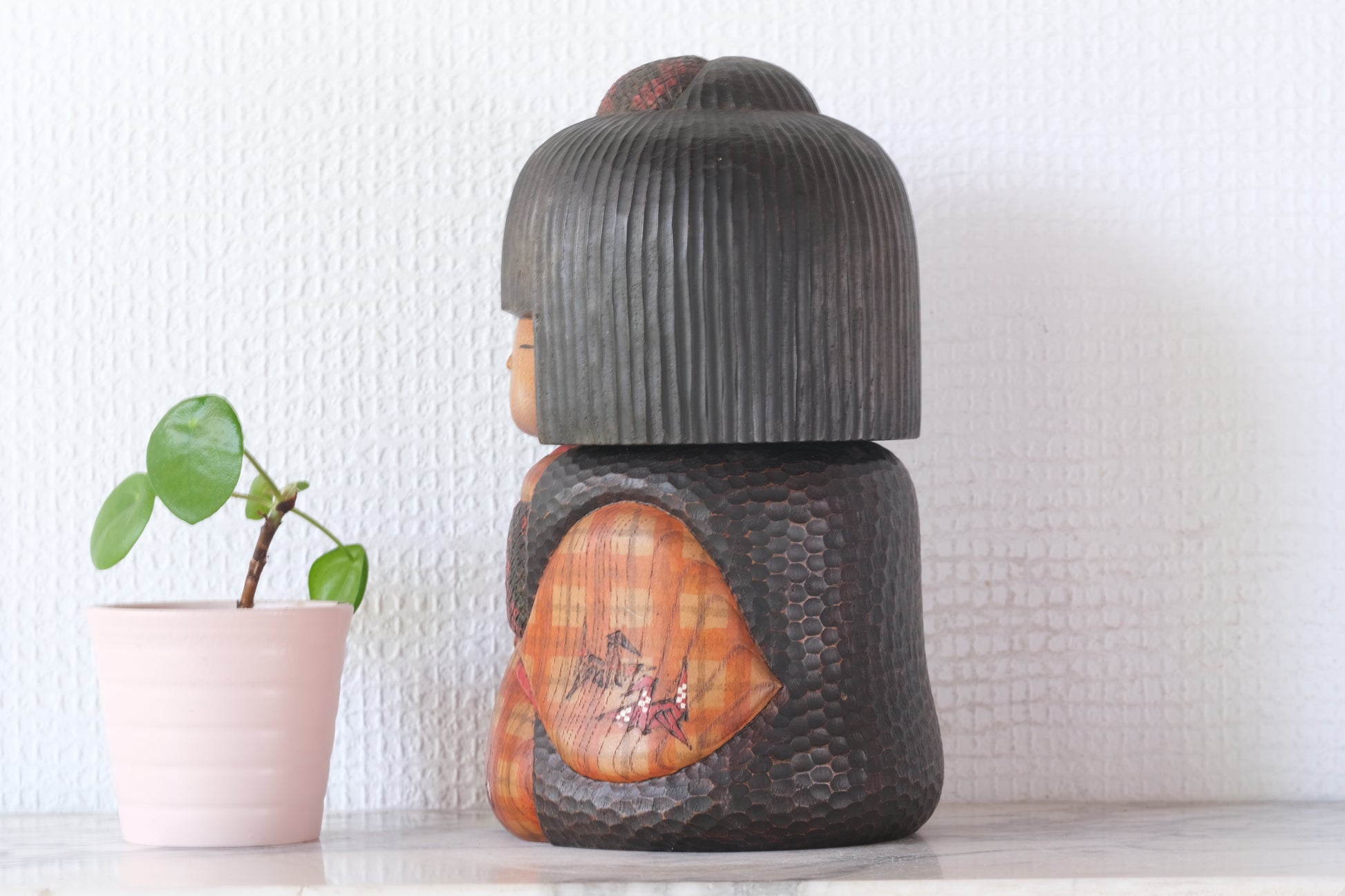 This is a cute Vintage Kokeshi by Fumio Tomidokoro. She is a really special one with a beautiful and detailed kimono with cranes. Love the details on her obi. She also has a very friendly face.