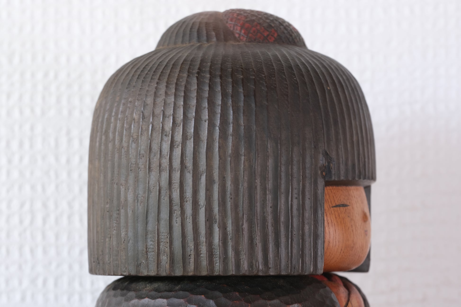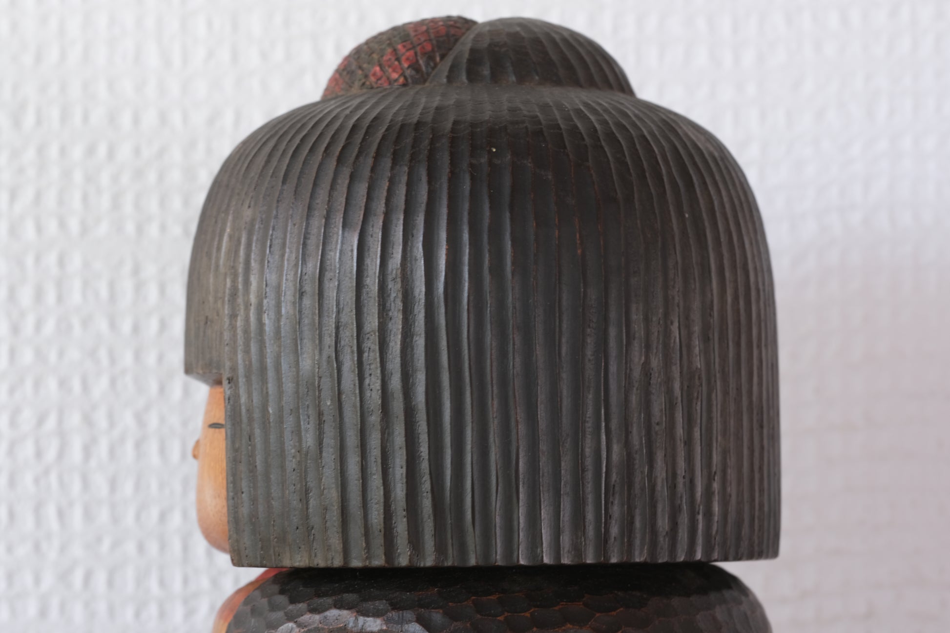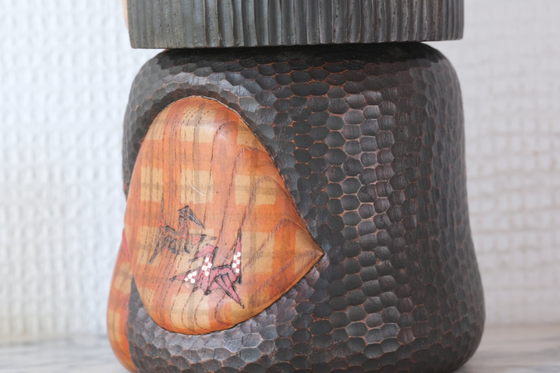 This is a cute Vintage Kokeshi by Fumio Tomidokoro. She is a really special one with a beautiful and detailed kimono with cranes. Love the details on her obi. She also has a very friendly face.